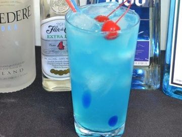 made with vodka, tequila, light rum, triple sec, gin, sour mix and a splash of blue curacao