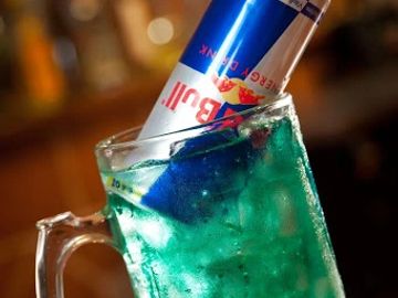 made with vodka, tequila, light rum, triple sec, gin, Peach shnapps, a splash of blue curacao and red bull.